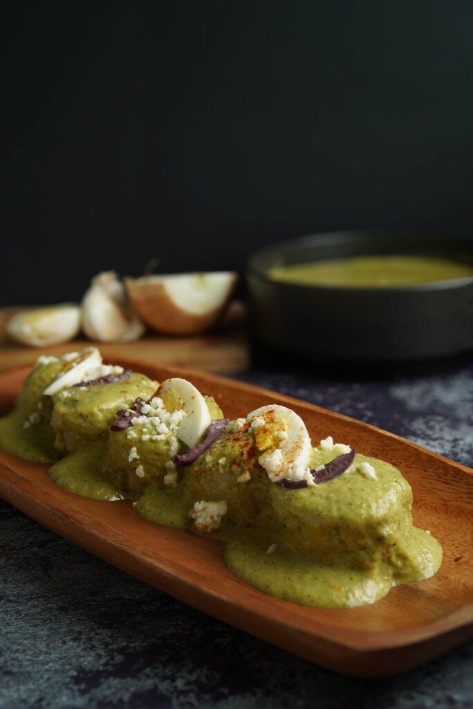Boiled potatoes topped with a creamy, spicy sauce made from ají amarillo peppers, roasted peanuts, cheese, and fresh herbs.