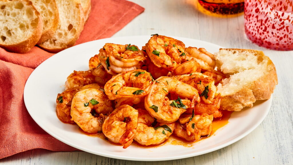 Shrimp cloaked in a garlic-infused olive oil and white wine sauce with smoky hints of paprika, parsley, and rosemary.