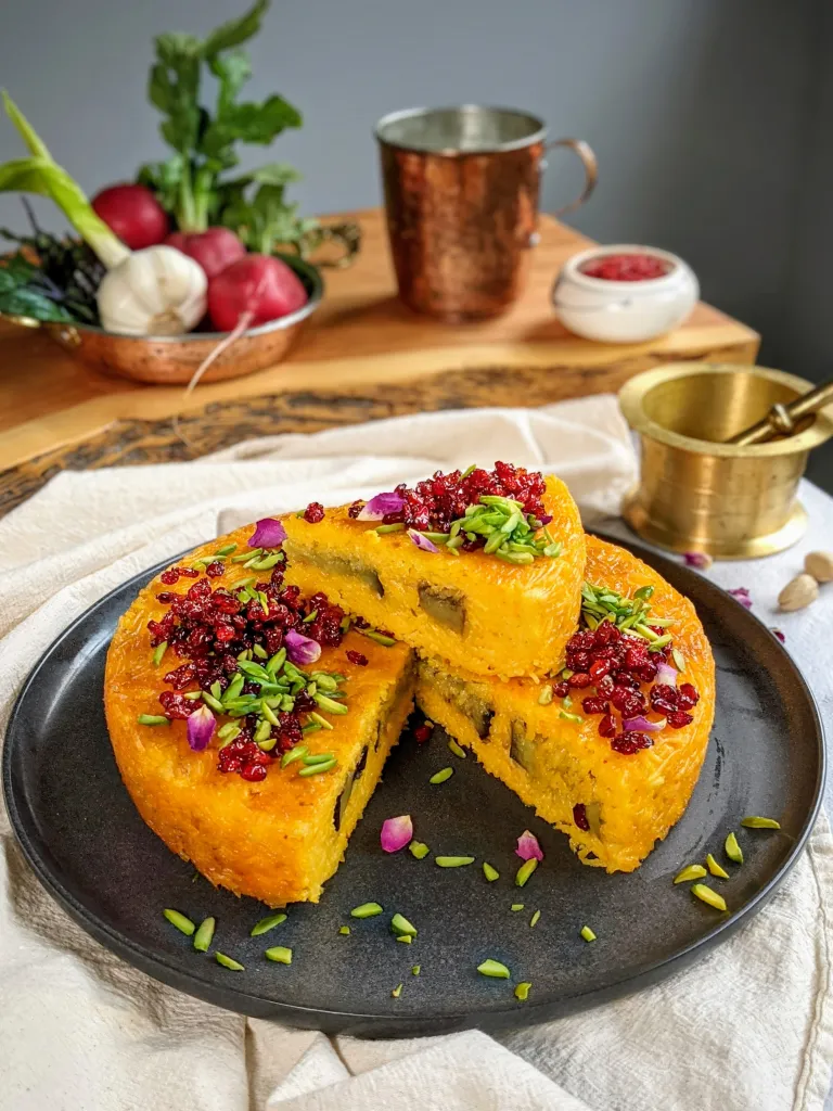 A beautifully layered Persian rice dish infused with fragrant saffron, creamy yogurt, and a golden, crispy crust, creating a rich and flavorful centerpiece.